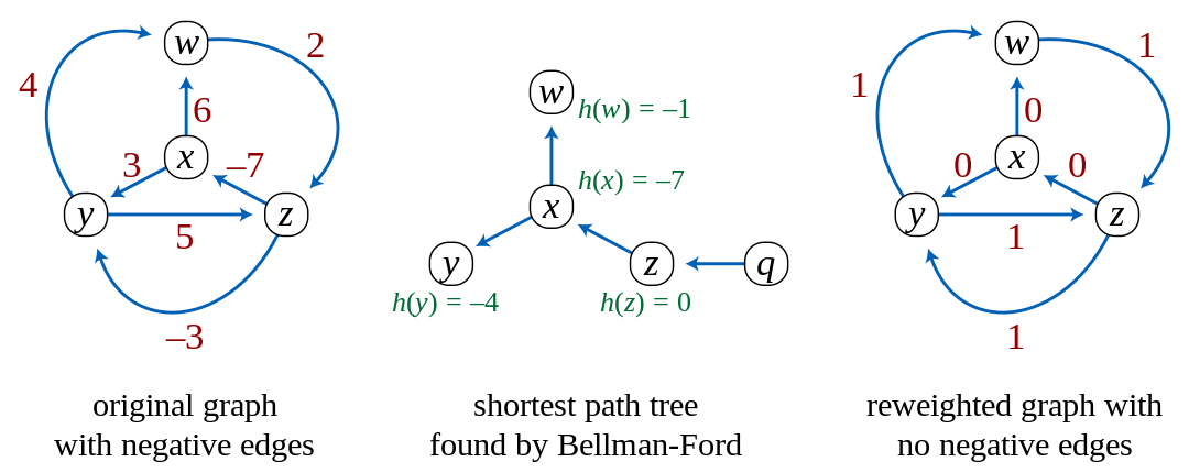 بنابراین کوتاه ترین مسیر ها تغییر نمیکنند و با اجرای الگوریتم دایکسترا برای هر راس در گراف جدید، کوتاه ترین مسیر بین هر دو راس را در گراف اولیه هم بدست می‌‌آوریم و برای بدست آوردن وزن کوتاه ترین مسیر بین $s$ و $t$ تنها کافی است مقدار $h(s)-h(t)$ را از وزن کوتاه ترین مسیر بدست آمده در گراف جدید کم کنیم تا مقدار واقعی بدست آید.