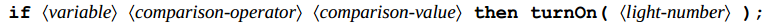 - <light-number> یک عدد ۳۲ بیتی است بیانگر شماره چراغ است که اگر گزاره شرطی برقرار باشد این چراغ روشن میشود (اگر از قبل روشن باشد اتقافی نمیافتد)