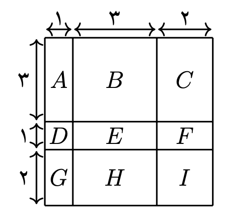 او ۲ خط از ۵ خط افقی و ۲ خط از ۵ خط عمودی را انتخاب می‌کند و شکلات را از روی آن خط‌ها بُرش می‌دهد تا تعدادی تکه‌ی کوچک‌تر ایجاد شود. هدف نگار این است که حداقل یکی از تکه‌های ایجاد شده ۱ × ۱ باشد. به عنوان مثال، اگر اولین و چهارمین خط عمودی از چپ، و سومین و چهارمین خط افقی از بالا برای بُرش انتخاب شوند، ۹ تکه ایجاد می‌شوند که مطابق شکل زیر، با حروفِ $A$، $B$، $\ldots$ و $I$ نام‌گذاری شده‌اند. با این شرایط، تکه شکلاتِ $D$ یک تکه‌ی ۱ × ۱ خواهد شد.