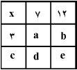 a+d+7=x+7+12 \quad \Rightarrow \quad d=12+x-a=21 \quad \Rightarrow \quad 3+a+b=7+a+d \quad \Rightarrow \quad b=28-3=25