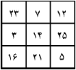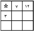 در جدول $3\times3$ی مقابل٬ عددهای طبیعی به صورتی نوشته شده بودند که مجموع اعداد هر ستون و مجموع اعداد هر قطر و مجموع اعداد هر سطر این مربع عدد ثابتی بود. متاسفانه تمام این عددها به جز سه عددی که در شکل نشان داده شده٬ پاک شدهاند. در خانهای که با علامت * مشخص شده٬ چه عددی قرار داشته است؟