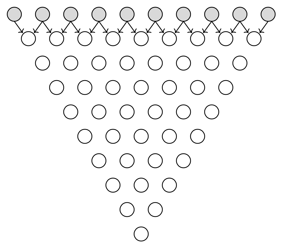 تعداد بارهایی که مقدار هر خانه در پایین‌ترین خانه‌ی هرم تاثیر دارد با توجه به مثلث خیام-پاسکال تعیین می‌شود. میزان تاثیر خانه‌ی $i$ام بالاترین سطر برابر با $\binom{9}{i}$ است. در نتیجه مقدار خانه‌های دوم تا نهم هیچ تاثیری در باقی‌مانده‌ی خانه‌ی پایین ندارد و خانه‌های اول و دهم دارای ضریب یک هستند. پس می‌توانیم دو خانه مانند خانه‌های اول و دوم را کنار گذاشته و سایر خانه‌های بالاترین سطر را به $3^8$ طریق مقداردهی کنیم. مقدار خانه‌ی اول با توجه به خانه‌ی دهم به صورت یکتا و سپس مقدار خانه‌ی دوم با توجه به جمع ۹ خانه‌ی دیگر به صورت یکتا تعیین می‌شود.
