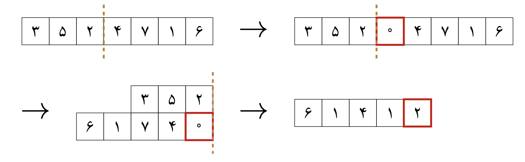 نواری به طول ۷ داریم که در ابتدا روی آن اعداد ۱ تا ۷ نوشته شدهاند. عمل تازا را بدین شکل تعریف میکنیم؛ ابتدا خطی دلخواه میان دو خانهی مجاور از نوار انتخاب میکنیم. سپس یک خانهی جدید با عدد صفر به سمت راست خط اولیه اضافه میکنیم. در ادامه نوار را از خط اولیه تا میکنیم و به جای مقادیر خانههایی که روی هم قرار گرفتهاند، مقدار یای انحصاری (\lr{XOR}) آن دو خانه را قرار میدهیم: