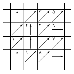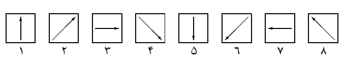 الف) از یک خانهی دلخواه این جدول شروع به حرکت میکنیم و در هر مرحله٬ بهیکی از خانههای مجاور خانهای که در آن هستیم٬ میرویم. با توجه به شرایط مسئله٬ جهت فلش خانهای که به آن میرویم نسبت به جهت فلش خانهای که در آن هستیم٬ به اندازهی ۴۵-٬ ٬۰ یا ۴۵ درجه در جهت عقربههای ساعت اختلاف دارد. مقدار این اختلاف درجه را یادداشت میکنیم. برای مثال٬ اگر شکل زیر نشاندهندهی قسمتی از جدول باشد و به ترتیب خانههای ۱ تا ۹ را طی کرده و به خانهی ۱ بازگردیم٬ به ترتیب عددهای$ ٬۰٬۰٬-۴۵٬۴۵٬۰٬۰٬۴۵٬-۴۵$ و ۰ را یادداشت خواهیم کرد.