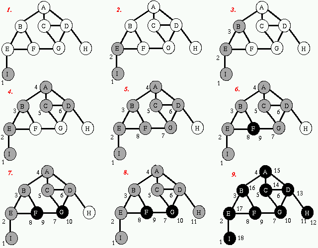 در طول پیمایش عمق اول گراف، رنگ رأسها را به این صورت مشخص میکنیم. ابتدای کار همهی رأسها را سفید میگیریم. زمانی که در این پیمایش وارد هر رأس شدیم آن را خاکستری میکنیم. هنگامی که تمام همسایههای یک رأس دیده شده بودند و در حال خارج شدن از آن رأس بودیم، آن را مشکی میکنیم. بدین ترتیب رأس خاکستری یعنی رأسی که هنوز کار آن تمام نشده و منتظر است تا کار بچههایش تمام شود، رأس سفید یعنی رأسی که هنوز ملاقات نشده و رأس مشکی یعنی رأسی که کار پیمایش آن تمام شده پس در آخر کار همه راس ها مشکی خواهند شد.