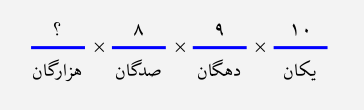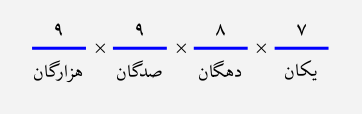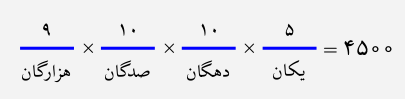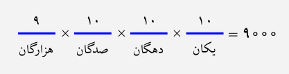 برای هر رقم، یک جایگاه، مانند شکل زیر، در نظر می‌گیریم و تعداد حالات آن رقم را می‌نویسیم. رقم هزارگان، ۹ حالت دارد (۰ نمی‌تواند باشد) و هر کدام از ارقام یکان، دهگان و صدگان، ۱۰ حالت دارند؛ بنابراین $9\times10\times 10\times10=9000$ عدد ۳ رقمی داریم.