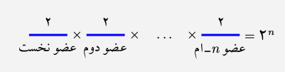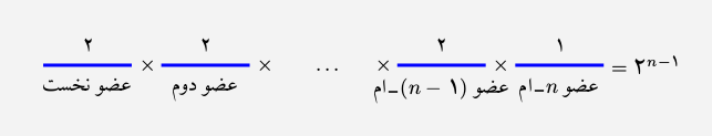 قسمت ۳: عضو اول مجموعه ۲ حالت دارد. یا در زیرمجموعه می‌آید یا در زیرمجموعه نمی‌آید. به همین ترتیب عضوهای دیگر به جز عضو آخر، هر کدام ۲ حالت دارند. حال اگر تاکنون فرد عضو آمده باشند، عضو آخر نباید بیاید و اگر زوج عضو آمده باشند، عضو آخر باید بیاید؛ بنابراین عضو آخر در هر صورت ۱ حالت دارد. پس در کل حالت داریم.