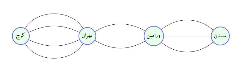 مثال: راه‌های ارتباطی بین چهار شهر کرج، تهران، ورامین و سمنان، مانند شکل زیر است (جاده‌ها، دوطرفه هستند): به چند طریق می‌توان با استفاده از این جاده‌ها، از کرج به سمنان رفت و به کرج برگشت؛ طوری که از هیچ جاده‌ای دو بار عبور نکنیم؟