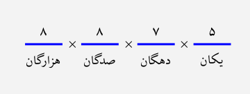 قسمت ۲: باز هم برای هر رقم، یک جایگاه، مانند شکل زیر در نظر می‌گیریم و تعداد حالات آن رقم را می‌نویسیم. رقم هزارگان ۹ حالت دارد (۰ نمی‌تواند باشد). رقم دهگان ۱۰ حالت، رقم صدگان نیز، ۱۰ حالت و رقم یکان ۵ حالت دارد (باید زوج باشد). بنابراین تعداد اعداد ۴ رقمی زوج، $9\times10\times 10\times5=450$ است.