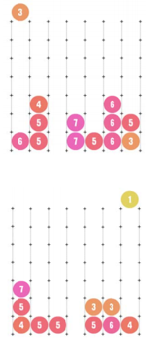 • ورودی شامل چندین تست است. هر تست با خطی شامل عدد $n$($ 1 \leq n \leq 1000$)، تعداد مهره‌های رها شده، شروع می‌شود. سپس در هریک از $n$ خط بعد ۲ عدد $v_i$ و $c_i$($1 \leq c_i, v_i \leq 7$)داده می‌شود که $v_i$ شماره مهره و $c_i$ شماره ستونی است که مهره‌را در آن رها می‌کنیم.