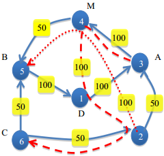 به خاطر مسائل اقتصادی کمپانی به دنبال روشی برای کاهش هزینههایش میباشد. یک جفت بسته را در نظر بگیرید، یکی قرار است از $ A $ به $ B $ و دیگری از $ C $ به $ D $ برده شوند.($ A $ و $ B $ و $ C $ و $ D $ فرودگاههای متمایزی هستند.) کمپانی ممکن است دو بلیط سفر برای دو داوطلب یکی از $ A $ به $ B $ و دیگری از $ C $ به $ D $ بخرد. اگر این دو سفر در فرودگاه $ M $ مشترک باشند($ M $ لازم نیست با بقیه متمایز باشد.) دو داوطلب میتواننند در $ M $ یکدیگر را ببینند و بستههایشان را عوض کنند. کمپانی نیز مطمئن است بستهها به مقصد رسیده و هزینهی کل ممکن است کاهش یافته باشد. برای مثال در شکل $ 6 $ زیر فرودگاه وجود دارد که پروازهای مستقیم با خطوط تیره و پروازهای غیرمستقیم با خطچین و نقطهچین نشان داده شدهاند.(هزینهی مسیرها روی آنها درج شده است.) یک بسته باید از فرودگاه به $ 3(A) $ و $ 5(B) $ یکی از $ 6(C) $ به $ 1(D) $ برده شوند. کمپانی میتواند برای نفر اول بلیط $ (3,4),(4,5) $ و برای نفر دوم بلیط $ (6,5),(5,1) $ را بخرد که هزینهی کل $ 300 $ خواهد شد. یک راه حل هم میتواند به این صورت باشد که برای نفر اول بلیط $ (3,4,1,2,6) $ و نفر دوم بلیط $ (6,2),(2,4,5) $ را بخرد، که هزینه $ 250 $ را خواهد داشت. دو نفر در فرودگاه $ 4 $ یکدیگر را میبینند و بستههایشان را عوض میکنند، نفر اول نیز در فرودگاه $ 1 $ مسیر را ادامه نمیدهد.