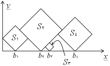 در این سوال دنباله‌ای از مربع‌ها $S_1, S_2, …, S_n$ با طول اضلاع طبیعی به شما داده می‌شود. مربع‌ها را به صورتی در قسمت اول صفحه مختصات قرار می‌دهیم که اضلاعشان با محور‌های $x$ و $y$ زاویه ۴۵ درجه ساخته و یکی از رئوسشان روی محور $x$ ها قرار بگیرد. فرض کنیم $x_i$ مکان $x$ رأس پایینی مربع $S_i$ باشد، $S_1$ را در مکانی قرار می‌دهیم که رأس چپش رو محور $y$ ها باشد. سپس مربع Si را طوری قرار می‌دهیم که $x_i$ کمینه شده و شروط زیر بر‌قرار باشد : ($i > 1$)