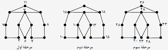 در ابتدا برای هر نقطهیک عدد طبیعی بهعنوان برچسب آن نقطه در نظر گرفته شده است. پس از آن در هر مرحله برای هر نقطه، از بین نقاط متصل به آن، نقطهیی که بزرگترین و نقطهای که کوچکترین برچسب را در مرحلهی قبل داشته است در نظر گرفته، مجموع برچسب آن دو را بهعنوان برچسب آن نقطه در آن مرحله قرار میدهیم. در شکل دادهشده، برچسب بعضی از نقطهها در ابتدا بر روی آنها نشان داده شده است. در مورد مجموع برچسب بقیهی نقاط در انتهای مرحلهی سوم چه میتوان گفت؟