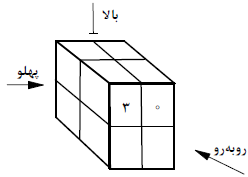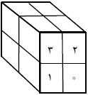 یک مکعب مشبک $2 \times 2 \times 2$ از ۸ «ریزمکعب» به ابعاد واحد تشکیل شده است. داخل هر ریزمکعب یک رقم صفر یا یک می‌نویسیم. وجه‌های این ریزمکعب‌ها که بر روی سطح مکعب قرار دارند را «وجه خارجی» می‌نامیم. یک وجه خارجیِ ریزمکعبی به‌نام $A$ را در نظر می‌گیریم. به این وجه یک عدد ۲ رقمیِ دودویی نسبت می‌دهیم. رقم با ارزش‌تر این عدد رقم نوشته‌شده‌ی داخل ریزمکعب $A$ و رقم دیگر آن رقم داخل ریز مکعب پشت $A$ (نسبت به وجه خارجی مورد نظر) است. این کار را برای همه وجه‌های خارجی انجام می‌دهیم. بنابراین روی هر سطح مکعب ۴ عدد دودویی با مقدار بین ۰ تا ۳ دیده می‌شود. به چند طریق می‌توان عددهای داخل ریزمکعب‌ها را تعیین کرد به‌گونه‌ای که روی هرکدام از سطح‌های مکعب، ۴ عدد متمایز قرار بگیرند؟