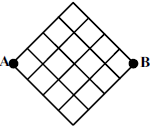 دو شخص با نامهای $A$ و $B$ در نقاط مشخصشده در شکل قرار دارند. شکل از مربعهای واحد تشکیل شده است. در هر ثانیه $A$ یک واحد به سمت راست و $B$ یک واحد به سمت چپ روی خطوط حرکت میکنند. هرگاه دو راه در مقابل یک نفر وجود داشته باشد، با احتمال مساوی یکی از آن دو را انتخاب میکند. احتمال اینکه $A$ و $B$ در ۸ ثانیهی اول در یک نقطه بههم برسند چهقدر است؟