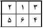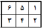 خانههای یک جدول $2\times 3$، با شش رنگ که با اعداد ۱ تا ۶ شمارهگذاری شدهاند، رنگ شدهاند. کاغذ را ۳ بار تا میزنیم تا در نهایت بهیک مربع $1\times 1$ برسیم، توجه کنید که تا زدن فقط روی خطوط افقی و عمودی جدول مجاز است. حال شش مربع $1\times 1$ به ترتیبی روی هم قرار گرفتهاند. کدامیک از رنگآمیزیهای زیر را نمیتوان ۳ بار تا زد به نحوی که رنگها به ترتیب ۱ تا ۶ روی هم قرار گرفته باشند؟