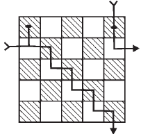 یک جدول $۵ \times ۵$ داریم که آن را به صورت شطرنجی سیاه و سفید کردهایم به طوری که گوشههای جدول سیاهاند. در ابتدا در خانهی سطر ۱ و ستون ۱ (خانهی بالا و سمت چپ) قرار داده ایم. در هر مرحله اگر در خانهی سیاه هستیم یک خانه به پایین و اگر در خانهی سفید هستیم٬ یک خانه به راست میرویم. دقت کنید که اگر به انتهای سطر یا ستون برسیم از طرف دیگر وارد میشویم. بعد از ۱۳۸۲ مرحله در کدام خانه هستیم؟