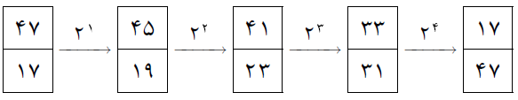 1 \end{array}$» میباشد که در آن دو عدد وجود دارد. در مورد اعداد ۴۷ و ۱۷ مقادیر اضافه شده به ترتیب به صورت $2^1 , 2^2 ,2^3 و 2^4$ میباشد که از قاعده بالا پیروی میکنند.