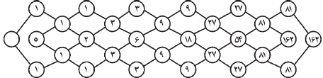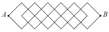 در شکل مقابل، اگر بتوان از روی خطوط فقط در جهت چپ به راست حرکت کرد، تعداد مسیرهای مختلف بین $A$ و $B$ برابر است با: