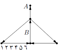 شکل روبهرو نشاندهندهی تعدادی خیابان و تقاطعهای بین آنهاست. خیابانها در جهت فلشها یکطرفه هستند. عرض هر خیابان هم بهاندازهیک ماشین است؛ یعنی ماشینها نمیتوانند از یکدیگر سبقت بگیرند. همچنین ماشینها نمیتوانند در محل تقاطعها بایستند. درنتیجه در هرلحظه هر ماشین فقط میتواند در یک خیابان قرار بگیرد. میدانیم کهیک ایستگاه عوارضی در خیابان $B$ قرار دارد و از هر ماشین که عبور میکند مبلغ ۱۰ تومان دریافت میکند. نقطهی $A$ که در شکل دیده میشود یک پارکینگ است. ماشینهای با شمارهی ۱ تا ۶ پشت سر هم قرار دارند. میخواهیم این ماشینها را به پارکینگ $A$ منتقل کنیم. کمترین مجموع مقدار عوارض پرداختی چه قدر است تا این ماشینها به ترتیب شمارههایشان (اول ۱ بعد ۲، …) وارد پارکینگ شوند؟