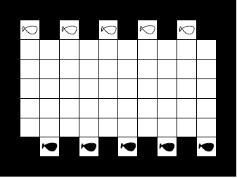 در شکل زیر هر کدام از مهره‌های داخل صفحه‌یک مهره‌ی ماهی است. مهره‌ی ماهی در صفحه سُر می‌خورد. یعنی در یکی از ۴ جهت حرکت می‌کند تا به‌یک خانه‌ی پُر برسد و در خانه‌ی خالی قبل از خانه‌ی پُر متوقّف می‌شود. قوانین بازی به شرح زیر است: