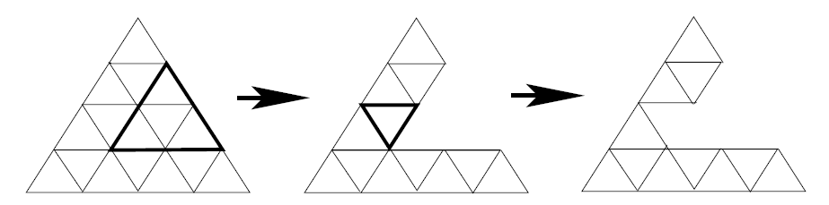 بدیهی است درصورتی که شکل باقیماندهیک مثلث متساویالاضلاع باشد میتوان در یک مرحله همهی آن را دور ریخت. در شکل زیر یک مثال تا دو مرحله نشان داده شده است.
