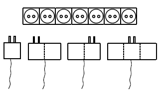 ۷ پریز برق با ابعاد $۱\times۱$ در یک ردیف٬ مطابق شکل روی دیوار نصب شدهاند. ۴ وسیلهی برقی در اختیار داریم که میخواهیم از آنها به صورت همزمان استفاده کنیم. دوشاخههای این وسیلهها مانند شکل با اندازههای $۱\times۳$٬ $۱\times۲$ ٬$۱\times۲$ و $۱\times۱$ هستند. به چند طریق میتوان این دوشاخهها را در پریزها قرار داد٬ به طوری که تمام وسیلهها روشن شوند؟ دقت کنید که مجاز به چرخاندن دوشاخهها نیستیم.