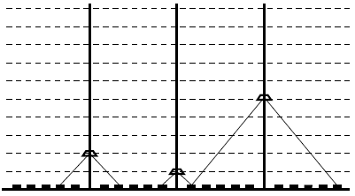 به چند طریق میتوان ارتفاع سه نورافکنی که در شکل مقابل نشان داده شده است را تنظیم کرد٬ به طوری که تمام ۲۰ جعبهی روی زمین٬ که با مستطیل سیاه نشان داده شدهاند روشن شوند؟ ارتفاع هرکدام از نورافکنها میتواند بین ۱ تا ۱۰ باشد. یک نورافکن در ارتفاع $i$٬ تا $i$ جعبه در سمت راست خود و $i$ جعبه در سمت چپ خود را روشن میکند.