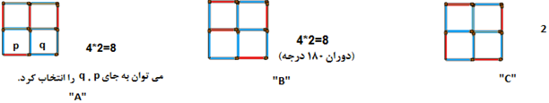 شکل زیر از ۱۲ چوبکبریت تشکیل شده است. به چند طریق میتوان ۸ تا از این چوبکبریتها را برداشت٬ به طوری که هیچ دو چوبکبریتی از چهارتای باقیمانده به هم وصل نباشند (در هیچ نقطهای اشتراک نداشته باشند)؟