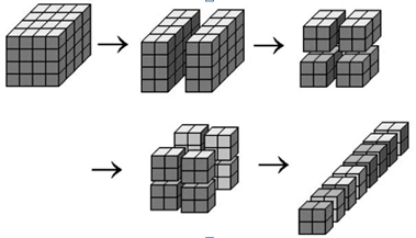 دقت کنید که ممکن است چند قطعهی تقسیم شده از قبل، با یک برش همزمان به دو قسمت تقسیم شوند. حداقل چند مرحله لازم داریم تا این مکعب به ۶۴ مکعب $1 \times 1 \times 1$ تقسیم شود؟