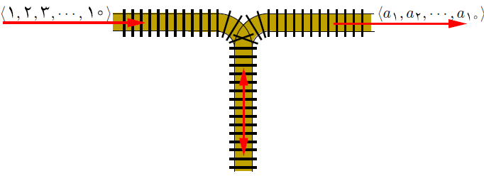 یک ردیف از قطار با شماره‌های ۱ تا ۱۰ پشت سر هم مطابق شکل زیر قرار دارند. این ردیف را با دنباله‌ی $\langle 1, 2, 3, …, 10\rangle$ نمایش می‌دهیم. قطار ۱ آخرین قطار است. بین ریل ورودی و ریل خروجی ریلی به نام «پارکینگ» دقیقاً مطابق زیر قرار گرفته است. هر قطار برای آن‌که در ریل خروجی ظاهر شود باید ابتدا به پارکینگ وارد شود. همیشه هم آخرین قطار موجود در پارکینگ دنده عقب به خروجی منتقل می‌شود. با این ترتیب در خروجی یک دنباله از قطارها (به ترتیب از راست به چپ) ظاهر خواهد شد که با $\langle a_1, a_2, …, a_{10}\rangle$ نشان می‌دهیم و به آن دنباله‌ی «قابل تولید» می‌گوییم. دقت کنید که $a_1$ آخرین قطاری است که خارج می‌شود. چند تا از دنباله‌های زیر قابل تولید هستند؟