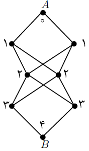 در شکل زیر به چند طریق میتوان از نقطهی $A$ به نقطهی $B$ رفت به طوری که هر یک از اعداد ۰ تا ۴ دقیقاً یک بار در طول مسیر در نقطهها مشاهده شوند؟