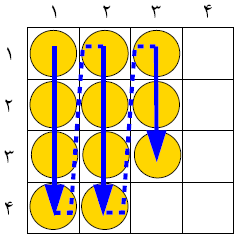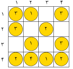 یک جدول $۱۶\times ۱۶$ را در نظر بگیرید که سطرها و ستونهای آن به ترتیب شمارههای ۱ تا ۱۶ گرفتهاند. هر خانه میتواند خالی باشد یا درون آن یک سکه قرار گرفته باشد. روی هر سکهیک شماره بین ۱ تا ۱۶ نوشته شده است٬ اما از هر شماره حداکثر ۱۶ سکه در جدول وجود دارد. در شکل روبهرو مثالی از یک جدول $۴\times ۴$ با ۱۱ سکه دیده میشود. توجه کنید که برای سادگی٬ دو شکل اول برای جدول $۴\times ۴$ رسم شدهاند. اما هر سه سوال را باید براساس جدول $۱۶\times ۱۶$ پاسخ دهید.
