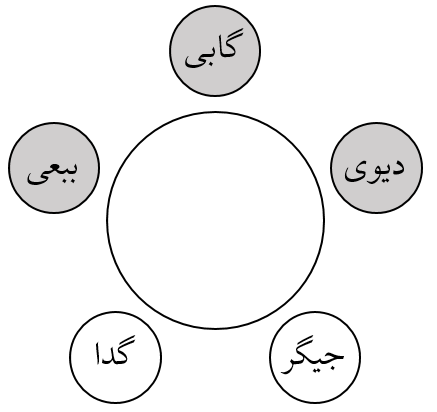 - هر کس را دو صندلی به سمت راست میبرد. (توجه کنید که صندلیها جابهجا نمیشوند و فقط خود افراد جابهجا میشوند.)