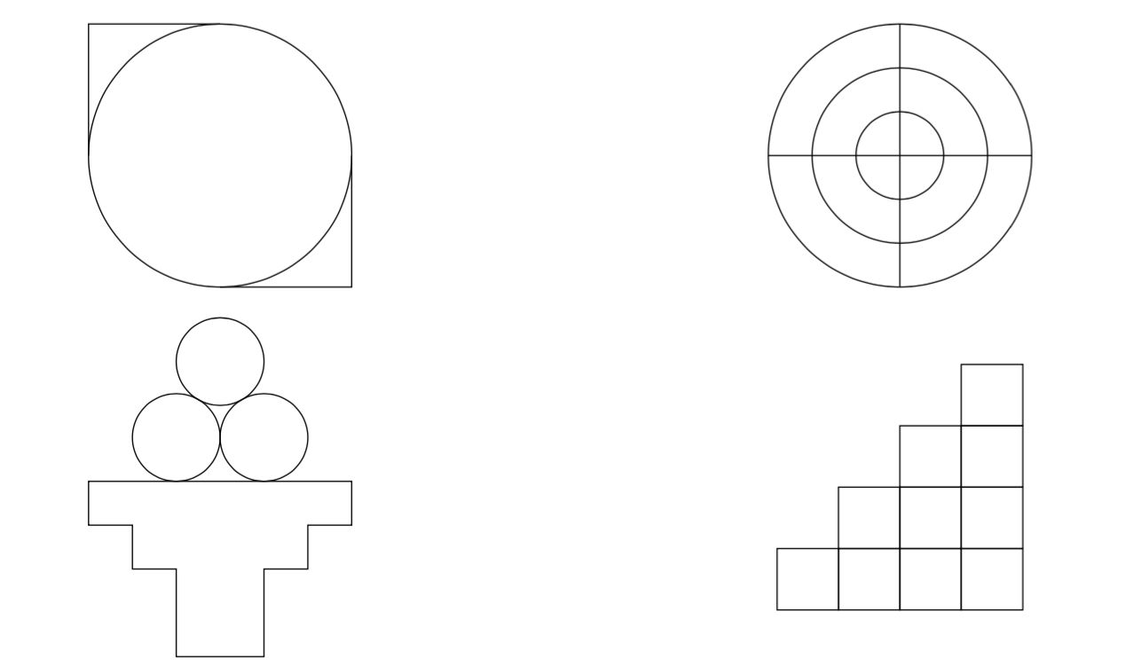 - روش ساختن شکل بالا-چپ: ابتدا یک دایره درون تفرقک آغازین میکشیم. سپس تفرقک آغازین را به چهار تفرقک برابر تقسیم میکنیم. در انتها دو تفرقک بالا-راست و پایین-چپ را پاک میکنیم.