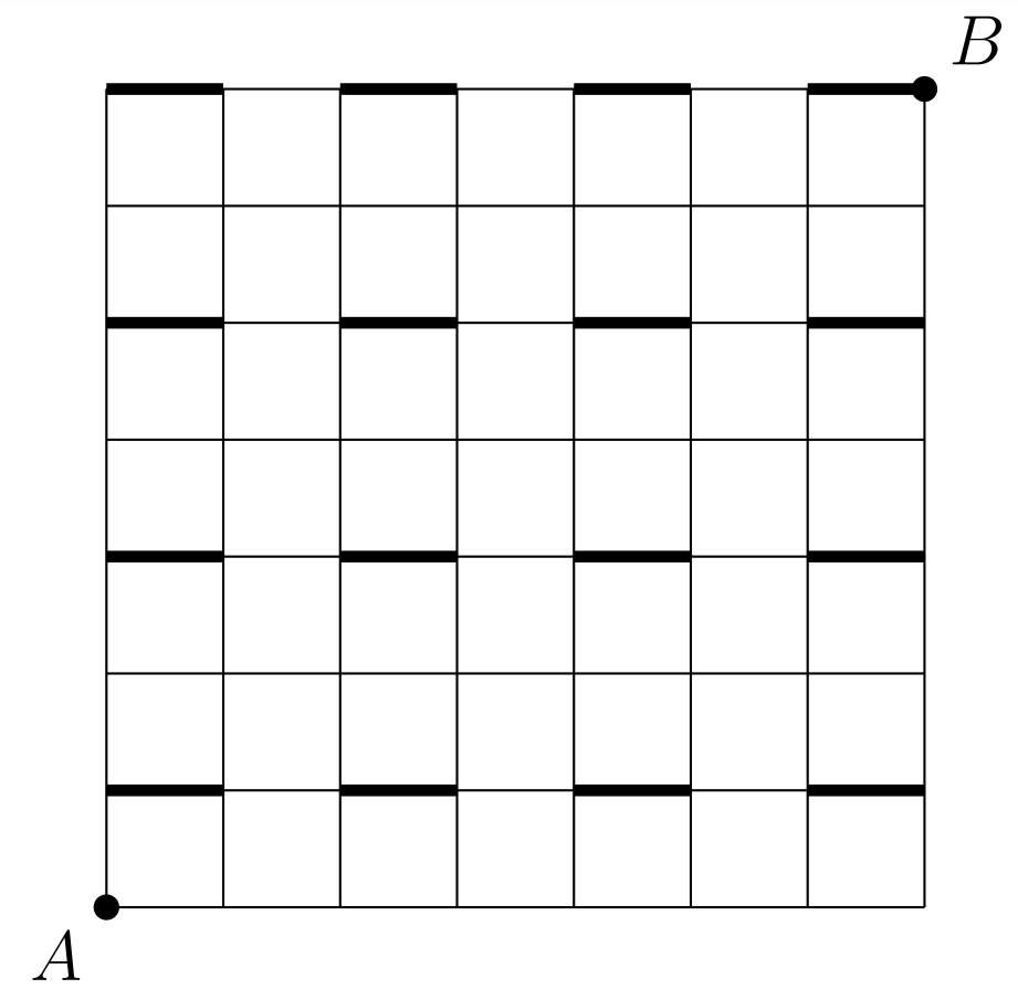 سلطان در ابتدا در نقطهی $A$ از شکل زیر قرار دارد و کلاهش روی سرش است. او هر مرحله میتواند با حرکت روی خطوط، یک واحد به راست یا یک واحد به بالا برود. سلطان به هنگام گذر از پاره خطهای پررنگ، وضعیت کلاه روی سرش را تغییر میدهد؛ یعنی اگر کلاه روی سرش باشد آن را برمیدارد و در غیر این صورت آن را روی سرش میگذارد. سلطان به چند طریق میتواند با تعدادی گام به نقطهی $B$ برسد، طوری که در نقطهی $B$ کلاه روی سرش باشد؟