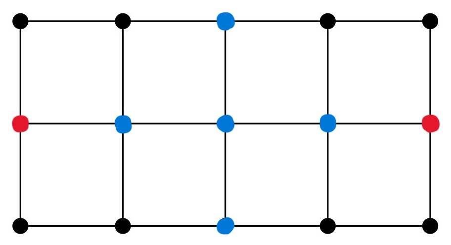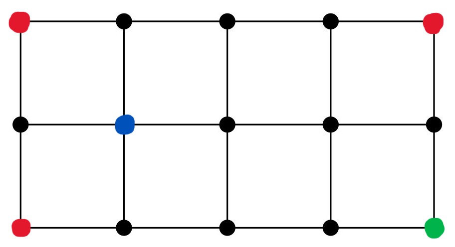 اگر $3$تا از نقطههای گوشهی شبکه علامت زده شده باشند، (بدون از دست دادن کلیت مسئله، فرض کنید نقاط قرمز شکل زیر علامت زده شدهاند و نقطهی سبز علامت زده نشدهاست)، با بررسی شرایط پوشش دادن نقطهی آبی، نشان دهید نمیتوان با علامت زدن $6$ نقطه همهی نقاط را پوشش داد.