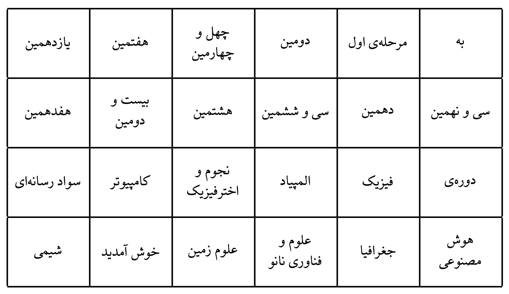 سارا تابلوی زیر را به مناسبت برگزاری آزمونهای المپیاد امسال آماده کرده است. او دو کاشی ۴ × ۱، یک کاشی ۳ × ۱، دو کاشی ۲ × ۱ و دو کاشی ۱ × ۱ دارد. هدف سارا این است که کاشیها را بهگونهای روی شکل بچیند تا در نهایت فقط کلمات جملهی «به مرحلهی اول سی و ششمین دورهی المپیاد کامپیوتر خوش آمدید» روی تابلو نمایش داده شود. او به چند روش متفاوت میتواند این کار را انجام دهد؟ کاشیهای هماندازه یکسان در نظر گرفته میشوند و هر کاشی را میتوان در صورت نیاز دوران داد.