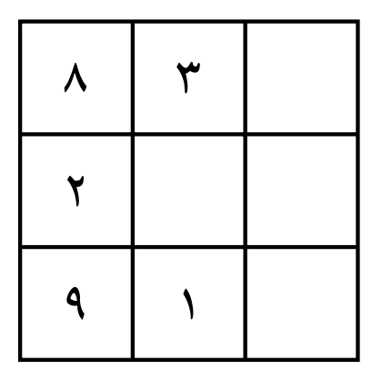 همچنین عدد ۸ تنها میتواند با اعداد ۱، ۲ و ۳ مجاور باشد، که بر اساس آنچه تا به اینجا به دست آوردهایم، تنها حالت ممکن این است که با عدد ۳ و یکی از دو عدد ۱ یا ۲ مجاور باشد و در نتیجه در یکی از ۴ گوشهی دیگر جدول است. بدون از دست دادن کلیت میتوان شرایط شکل زیر را در نظر گرفت.
