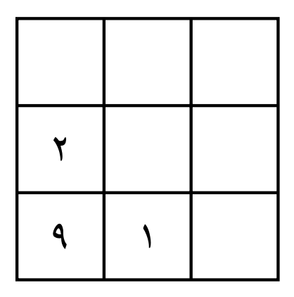 نشان میدهیم این مقادیر، تنها مقادیر ممکن برای خانهی وسط هستند. میدانیم جمع هر دو عدد مجاور حداکثر برابر ۱۱ است. پس عدد ۹ تنها با اعداد ۱ و ۲ مجاور است. یعنی در یکی از ۴ خانهی گوشهی جدول است. بدون از دست دادن کلیت مسئله فرض کنیم جدول مانند شکل زیر باشد.