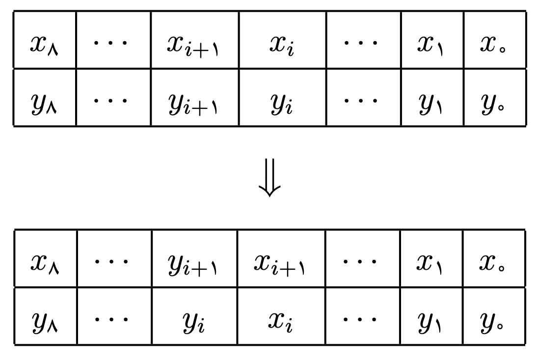 دو عدد دودویی ۹ رقمی $x = (x_8 \ldots x_1 x_0)_2$ و $y = (y_8 \ldots y_1 y_0)_2$ را در نظر بگیرید. هر رقم از این اعداد می‌تواند مقدار ۰ یا ۱ داشته باشد. هربار می‌توانیم عملیات چرخونک را روی این دو عدد انجام دهیم. در این عملیات، ابتدا یک عدد دلخواه مانند $0 \leq i \leq 7$ انتخاب می‌کنیم و سپس ترتیب ارقام دو عدد $x$ و $y$ را در جایگاه‌های $i$ و $i+1$ ام به صورت زیر تغییر می‌دهیم.