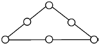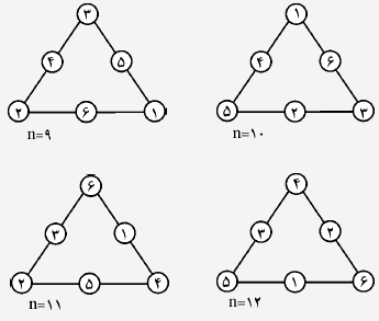 اعداد ۱ تا ۶ روی اضلاع یک مثلث (شکل مقابل) باید طوری قرار داده شوند که مجموع اعداد روی هر ضلع مثلث مساوی $n$ باشد. $n$ چه مقادیری میتواند باشد؟