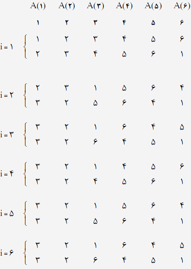 آرایهی ۶تایی $A$ به ترتیب با عددهای ۱ تا ۶ پر شده است. پس از اجرای الگوریتم زیر عدد ۶ در کدام خانه خواهد بود؟