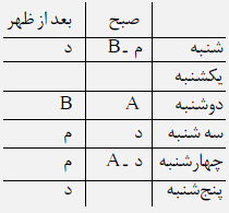 ترتیب انجام کارها باید به گونهای باشد که قبل از گرفتن فرم٬ مدیر را ملاقات کرده باشد. مدیر در روزهای شنبه صبح و سهشنبه بعداز ظهر و چهارشنبه بعداز ظهر حضور دارد. دفتر روزهای سهشنبه صبح٬ چهار شنبه صبح و شنبه بعداز ظهر و پنجشنبه بعد از ظهر باز است. معلم $A$ روزهای دوشنبه صبح و چهار شنبه صبح و معلم $B$ روزهای شنبه صبح و دوشنبه بعداز ظهر حضور دارند.