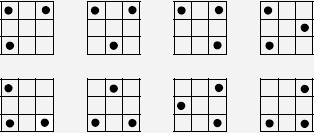 یک مهرهی شاه در صفحهی شطرنجی تمام ۸ خانهی اطراف خود را تهدید میکند. به چند طریق میتوان ۳ مهرهی غیر متمایز شاه را در یک صفحهی $3\times3$ قرار داد به قسمی که هیچ کدام همدیگر را تهدید نکنند؟