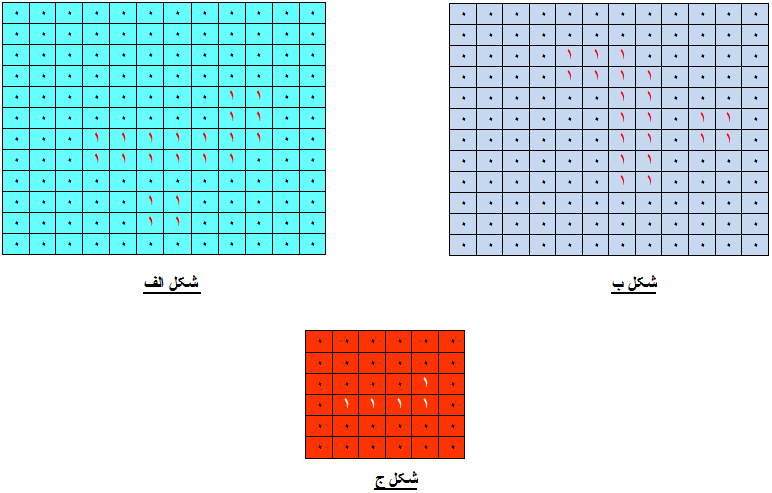 یک ماتریس $12 \times 12$ متشکل از اعداد صفر و یک را در نظر بگیرید. هر سطر این ماتریس را میتوان به عنوان یک عدد ۱۲ رقمی در مبنای ۲ در نظر گرفت که با تبدیل آن به مبنای ۱۰ یک عدد صحیح نامنفی به دست میآید. با تبدیل این عدد به مبنای ۲ و در صورت لزوم افزایش ارقام از سمت چپ تا ۱۲ رقم دوباره میتوان به سطر ماتریس دست یافت. در ماتریس فوق ارقام ۱ شکلی را به وجود میآورند، (مانند شکل الف). ماتریس فوق را «۹۰ درجه دوران یافته» مینامیم در صورتی که شکل داخل آن نسبت به مرکز ماتریس، ۹۰ درجه در جهت مثبت مثلثاتی دوران داده شود، (مانند شکل ب). ماتریس فوق را «فشرده شده» مینامیم در صورتی که هر ماتریس $2\times 2$ داخل آن را با شرایط زیر بهیک درایه تبدیل کنیم. در صورتی که تعداد درایههای مساوی ۱ یک ماتریس $2\times 2$ داخلی بیشتر از یک باشد آن ماتریس را بهیک درایهی ۱ و در غیر این صورت بهیک درایهی صفر تبدیل میکنیم، (مانند شکل ج). (ماتریسهای $2 \times 2$ را از گوشه سمت چپ و بالا در نظر میگیریم).