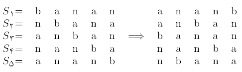 رمز شدهی رشته $S$ از دو قسمت تشکیل شده است: قسمت اول رشتهای است که از حروف ستون آخر جدول از بالا به پایین به دست میآید و قسمت دوم شمارهی سطر $S$ در جدول است. با توجه به جدول بالا رمز شدهی banan، زوج (bnnaa,۳) است. ثابت کنید این روش رمز کردن برگشتپذیر است. بهعبارت دیگر ثابت کنید میتوان از هر زوج رمز شدهی متناظر یکرشته، به رشتهی منحصربهفرد اولیه رسید. روشی برای به دست آوردن رشتهی اولیه بیان کنید. روش خود را به صورت دقیق و گامبهگام بیان کنید و مراحل مختلف آن را برای رمز یابی زوج (sfaraf,۶) نشان دهید.