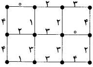 یک شبکه $m\times n$ از نقاط را در نظر بگیرید که در آن هر نقطه توسط پارهخطهایی به نقاط مجاورش در بالا، پایین، چپ و راست (در صورت وجود) وصل است. (طول هر یک از پارهخطها را یک واحد فرض کنید.) یک مسیر دنبالهای از پارهخطهای به هم متصل این شبکه است. منظور ازیک مسیر «کوتاه»، مسیری است که ابتدای آن نقطهی «بالا و سمت چپ» شبکه و انتهای آن نقطهی «پایین و سمت راست» شبکه باشد و نیز یکی از کوتاهترین مسیرهای بین این دو نقطه باشد (یعنی کمترین تعداد پارهخط را داشته باشد). عدد طبیعی دلخواه $k$ داده شده است. میخواهیم روی هر یک از این پارهخطها عددی صحیح از میان اعداد ۰، ۱، … و $k-1$ بنویسیم با این شرط که مجموع اعداد پارهخطهای هر مسیر کوتاه، باقیماندهی ثابتی در تقسیم بر $k$ داشته باشد. برای مثال در جدول زیر $n$، $m$ و $k$ به ترتیب برابر ۴، ۳ و ۵ اند. همچنین مجموع اعداد روی پارهخطهای تمامی مسیرهای کوتاه در تقسیم بر ۵ باقیماندهی ۱ را تولید میکنند.