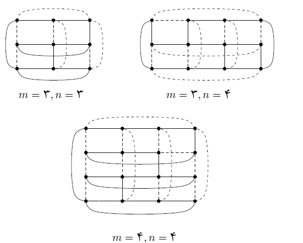 - ساخت دومین دور همیلتونی: در اول یالهای گراف شبکه $m_0 \times n_0$ وسط را منطبق با دور ناخوب اتخاب میکنیم. دقت کنید که درجه هر راس در هر دور همیلتونی $2$ است پس باید تمامی $4$ یال متصل به هر راس در اجتماع $2$ دور همیلتونیهای مجزا وجود داشته باشد، پس با توجه به اینکه دور خوب دقیقا یک یال خوب دارد و در دور همیلتونی دیگر این گراف شبکه (دور ناخوب) باید تمامی یالهای خوب ناموجود در دور خوب، وجود داشته باشد پس $m_0-1$ یال خوب سطری به ترتیب در سطرهای $1,2,3…,m_0-1$، در دور ناخوب وجود دارد. گقته بودیم کهیالهای خوب سطری دورهای همیلتونی فرض استقرا باید از شبکه $m_0 \times n_0$ وسطی دورمان حذف شوند. پس بجای یال خوب سطر $i$ ام در شبکه $m_0 \times n_0$ وسط ، $3$ یال $\lbrace (i,1) \leftrightarrow (i,2) , (i,1)\leftrightarrow(i,n_0+2) , (i,n_0+1)\leftrightarrow(i,n_0+2) \rbrace $ را برای دورمان اتخاب میکنیم. بجز برای $i=1$ و $i=m_0$ کهیالهای مورد نیاز در این دو حالت را جداگانه اضافه میکنیم. در حالت $i=1$ به خاطر اینکهیال خوب این سطر در اولین دور همیلتونی که ساختیم استفاده شده، پس فقط دو یال $\lbrace (i,1) \leftrightarrow (i,2) , (i,n_0+1)\leftrightarrow(i,n_0+2) \rbrace $ را انتخاب کرده و به جای یال خوب سطر $1$ یالهای خوب ستونهای $1$ و $n_0+2$ را انتخاب میکنیم. برای $i=m_0$ هم دو یال $\lbrace (m_0,1) \leftrightarrow (m_0,2) , (m_0,n_0+1)\leftrightarrow(m_0,n_0+2) \rbrace $ در ساخت دور همیلتونی$2$ استفاده شدهاند، پس در این حالت با توجه به اینکهیالهای خوب ستونهای اول و آخر در حالت قبل برای دور اتخاب شدهاند، ما فقط یال خوب سطر $m_0$ را اضافه میکنیم و بدین ترتیب ساخت دورمان تمام میشود و با توجه به نحوه چینش یالها و فرض استقرا مجموعهیالهای این دور یک دور همیلتونی را تشکیل میدهند.