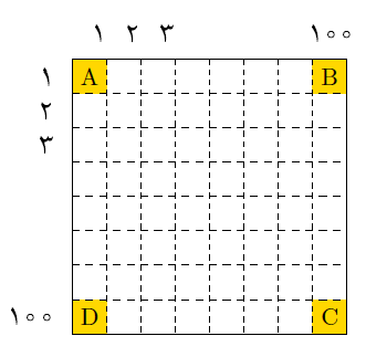محققی بر روی رفتار نوعی حلزون تحقیق میکند. او دستگاهی شامل یک جدول $100×100$ ساخته است و حلزون را روی آن قرار داده است. حلزون هر روز صبح شروع به حرکت میکند و هنگام شب بهیکی از خانههای مجاور آن میرسد (اگر دو خانه ضلع مشترک داشته باشند میگوییم مجاورند) و شب را در آنجا استراحت میکند. فردا صبح دوباره حرکت را شروع میکند. در ضمن حلزون نمیتواند از جدول خارج شود. جدول در شکل زیر نشان داده شده است. نام چهارگوشهی جدول را مطابق شکل خانههای $A$, $B$, $C$ و $D$ میگذاریم.